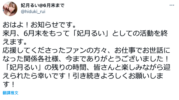 頂級片商S1出道、著名的企劃女優「妃月るい(妃月留衣)」在昨天發表了聲明,說妃月るい(妃月留衣)這名字即將活動到六月底,謝謝大家這些年的照顧⋯