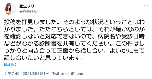 對方說看到宝生發文了,想要事情往好的方向發展,但不確定宝生所說是真是假,所以希望宝生能提供看病的時間和醫院的名稱,這樣子他就願意和宝生好好談談〜