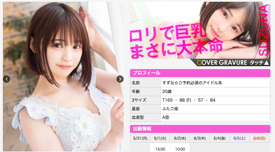 在出道擔任AV女優之前,她是在名古屋風俗店「ハーベストムーン」上班的すずな(鈴菜),個子很高(165)、胸部不小(F)、被店裡用「必須預約的偶像系」強力促銷,還替她設了twitter,可說是雞中之霸;而且很屌的是AV作品一支接一支發,待在名古屋接客的她也是一炮接一炮地和客人不斷連結,看看班表,明後天她都會上班⋯