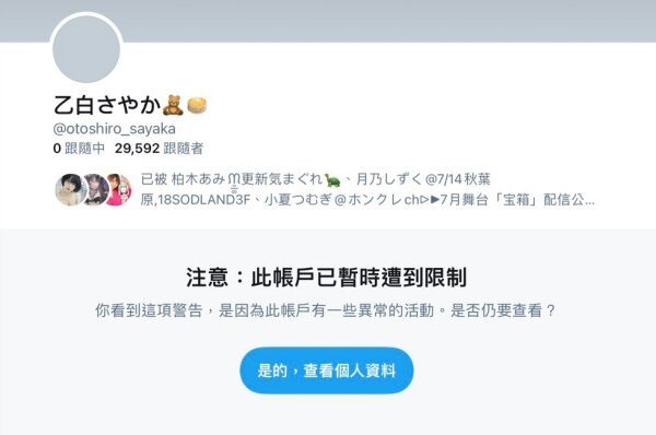 進去就會看到因為一場活動的緣故,她的帳戶遭到限制,但還好,帳號還在,你可以選擇查看個人資料,然後你就會發現乙白さやか(乙白沙也加)現在的Twitter長得是這個樣子: