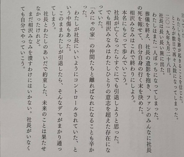 為了賺錢嗎?唉呀,做人不用這麼負面,一起聽聽相沢みなみ(相澤南)自己怎麼說:在最近出版的小說中,身為故事女主角的她也坦承,在社長過世後,原本她也決定「相沢みなみ(相澤南)」這身分到此為止,該是恢復本名往其他方向前進的時候了,但是ー