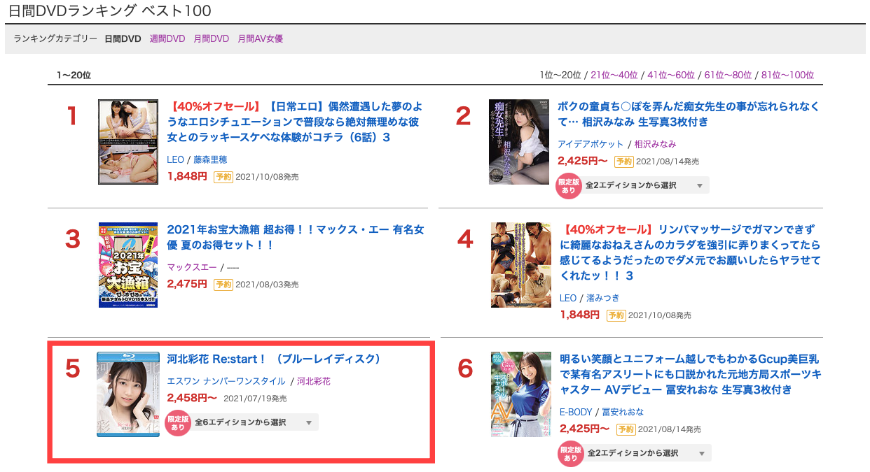 不過硬體條件還是非常棒啦,而且之前6支作品累積的神秘感一次爆發,在S1以頂天規格行銷後她不只twitter追蹤迅速破了4萬,作品銷售更是把所有女優按在地上摩擦ー直到昨天她的回歸作「河北彩花 Re:start!」在FANZA通販的日間排行榜仍然高居第五,這成績應該會讓很多女優氣得跳腳〜