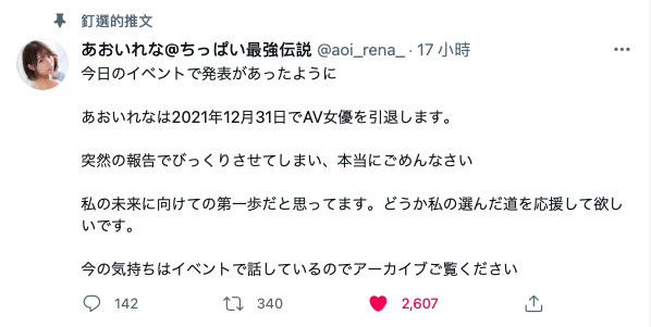 在昨天慶祝出道6週年的活動上(她是2015年7月25日於片商kawaii*出道),有貧乳界霸主之稱的あおいれな(葵玲奈)宣布做到今年為止ー12月31日,就是她在AV界的最後一天了,2022年,她就要卸下あおいれな(葵玲奈)的身分了⋯
