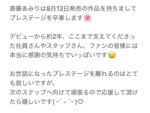 如果一定要給個理由應該是乃木絢愛的到來讓Prestige調整了女優陣容,之後我會再做確認。至於斎藤あみり(齋藤亞美里)的下一步要怎麼走呢?除了感謝影迷和Presitge的工作人員外她也說會在下個舞台繼續努力,以其經紀公司的勢力來看應該就是會先去アタッカーズ(Attackers)當個短期專屬吧: