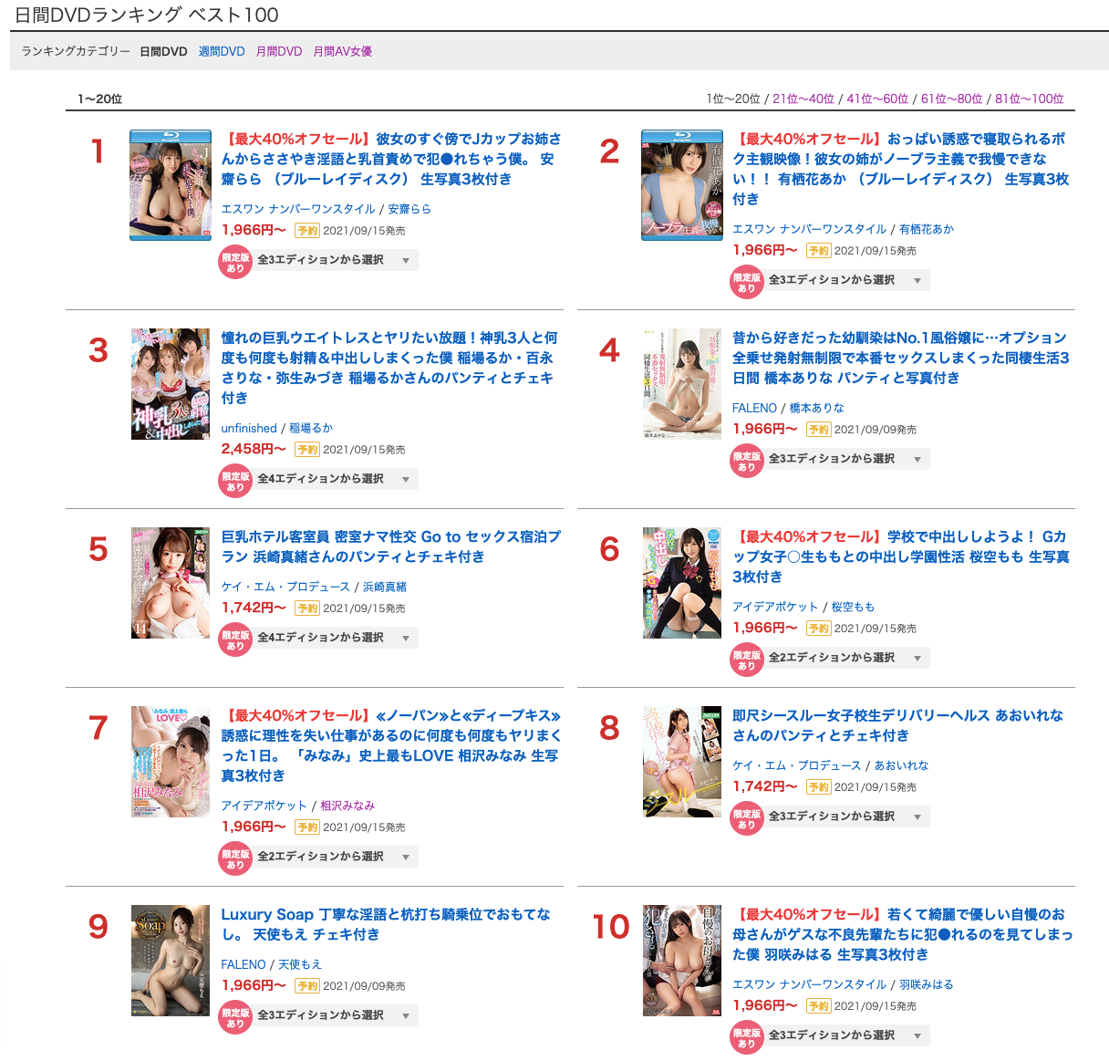 只能說神乳就是神乳,不知道用了什麼魔法只瘦腰身不縮神乳的安齋らら(安齋拉拉)再度展現了宰制力拿下單日第一,而從排行第二的是有栖花あか(有栖花緋)就知道現在是神乳的時代,胸巴巴才是王道。只是話說回來,雖然一天的榜單不代表安齋一定贏,但令我意外的是ideapocket賣最好的竟然不是相沢みなみ(相澤南),而是桜空もも(櫻空桃):