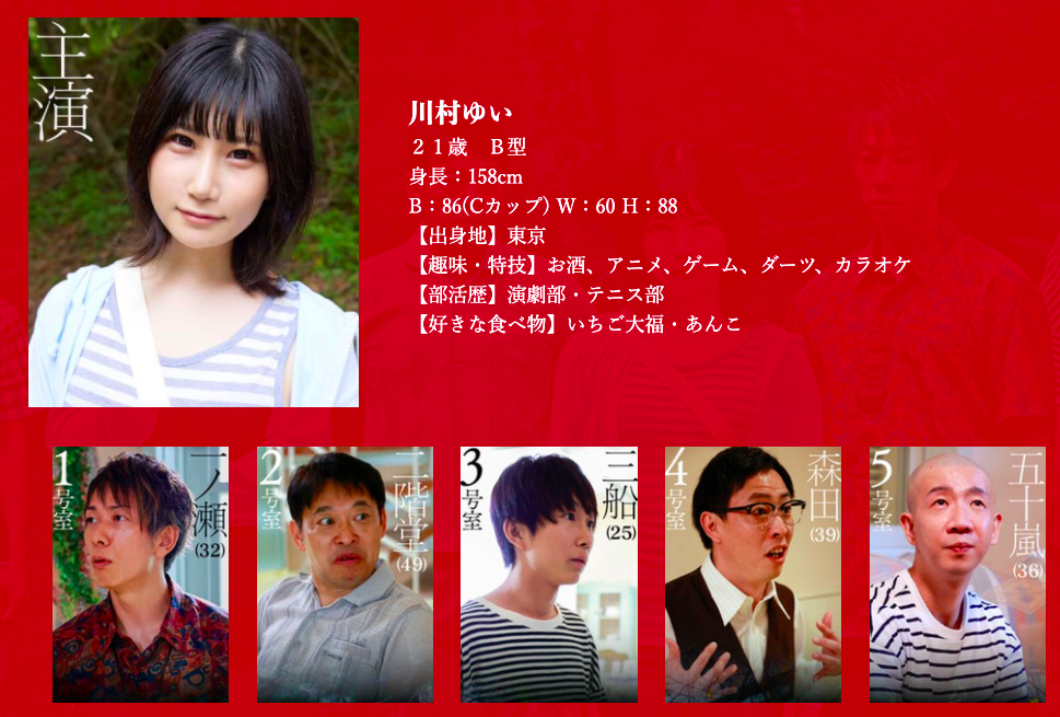 SOD是與搞笑組合「さらば青春の光」的成員森田哲史合作打造了這支作品:劇情是這樣的,五個男人和一個女人因緣際會地住進同一間別墅,他們分別是一號房的記者一ノ瀬(しみけん飾)、二號房已婚的二階堂(吉村卓飾)、三號房始終沒走出情傷的三船(結城結絃)飾、四號房的偵探森田(森田哲史本人演出)以及五號房還是處男的五十嵐,他們都有自己的秘密以及來到這棟別墅的原因,加上六號房背景來歷都是謎的女性「川村ゆい(川村唯)」,串成這齣戲的人際網路⋯