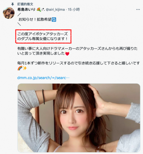 簡單地說吧,就是她移除了Premium的專屬女優身分,現在是ideapocket和アタッカーズ(Attackers)的雙專屬女優ー其實一路看下來相信大家也心知肚明了,希島待在AV界這麼久了,重點是要維持專屬女優的身分,至於是在哪一家片商倒沒那麼重要,能待在出道的ideapocket很好,但失去了再找一家片商就是了⋯