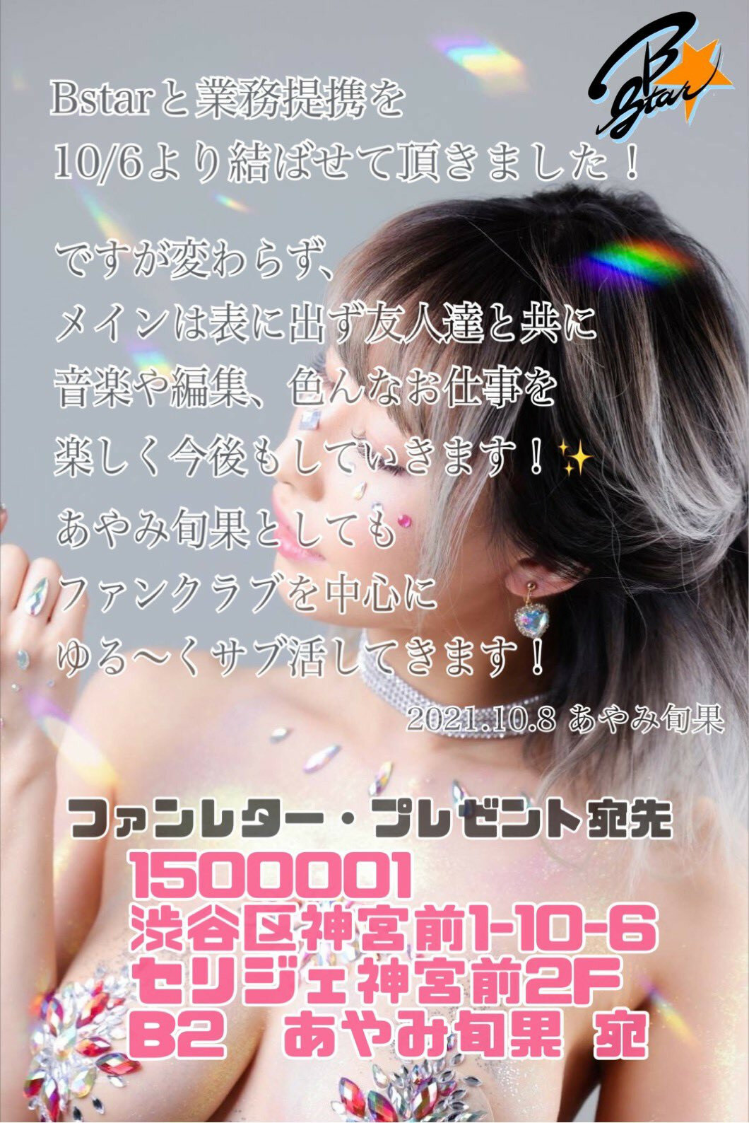 讓大家有疑問的應該是她置頂的這篇文章吧:上面寫的很清楚,あやみ旬果(彩美旬果)從原先的事務所Mine’s移籍去了BStar,以後寄禮物記得改地址喔〜