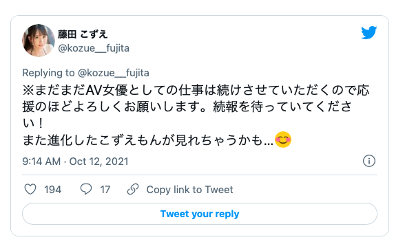 她自己是蠻看得開的,除了感謝S1自出道以來的照顧外也說了不會引退,還要大家好好看看自己的成長ー所以我常說這一行真的不是一分努力一分收穫,論認真藤田こずえ(藤田梢)應該是同期新人中數一數二的好學生,社群更新得快又多而且還努力想梗,社群交出的成績單也不錯,但和同期的はやのうた(早野詩)就稍微差了些⋯