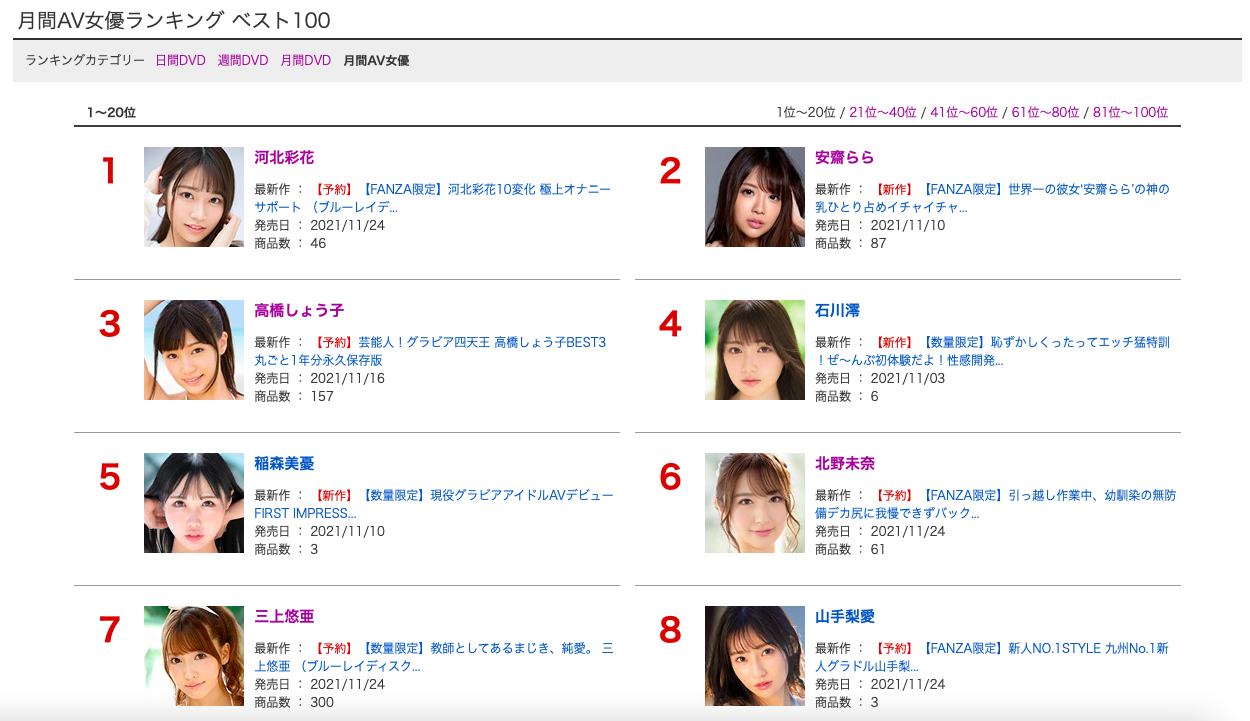只是調動三上悠亜實在讓人蠻驚訝的,以上個月的銷售排名來看,三上一共有3支作品進入百大,排名分別是21、77、98(兩支是這個月預約的片子,一支是上個月已經發售的作品),累積銷售量的排名則是第7,雖然沒有作品打進前20名,但總銷售量在S1也只輸給了安齋らら(安齋拉拉)和河北彩花兩位女優,結果S1竟然在2021年的最後一個月調整她的檔期?