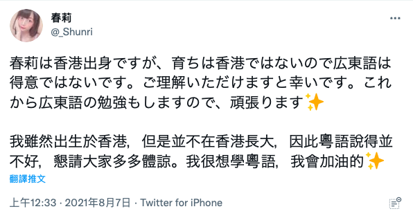 早在8月初她就在twitter上現身了,那時候她用的就是「春莉」的名字,說自己是香港出身,也會用中文回覆留言;不過她也說了,自己並不是在香港長大的,粵語說得不好,日文也還在努力,未來會好好加油: