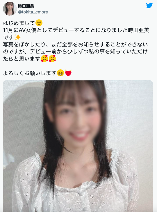 所以請她趕快下馬⋯不是,趕快現身吧;而在時田亜美確定好出道的片商後,假如8MAN沒搞錯的話,他們不但有個新人會在S1出道,在前一天,也就是11月22日還會有一位新入行的女優情報解禁,2021年的最後一個月,AV界真是新人大行其道,精采非常啊〜