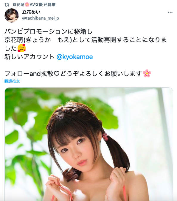 在2018年以「芸能人kawaii*専属決定!グラビアタレント立花めいAVデビュー」出道的她在twitter宣布加入經紀公司Bambi Promotion,並且改名為「京花萌」: