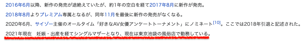 消息的來源是麻倉憂的日文維基百科,在「略歴」最底下多了一行,寫著「2021年現在 妊娠・出産を経てシングルマザーとなり、現在は東京池袋の風俗店で勤務している。(2021年現在,在懷孕、生產後成了單親媽媽,目前在東京池袋的風俗店上班)」: