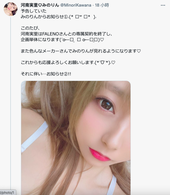 有兩點,首先,河南実里證明了大家的猜測,她與Faleno的專屬契約已經結束,但還好,她不打算引退,接下來要以企劃女優的身分繼續奮鬥;再來,她決定要開設粉絲俱樂部了,時間定在12月1日,細節會在當天再公布: