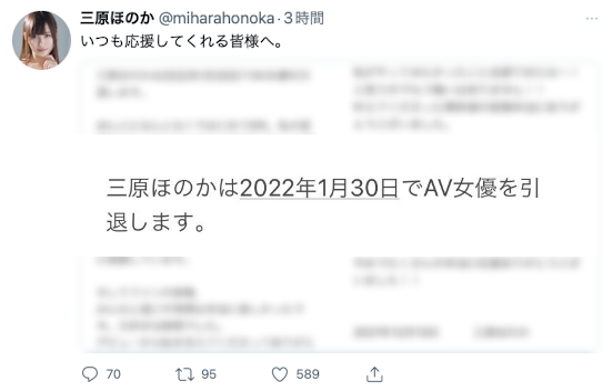 出道6年、可說是這一行最好M女的三原ほのか(三原穗花)剛剛宣布引退,明年1月30日,做完最後的活動後她就要和大家說再見了~