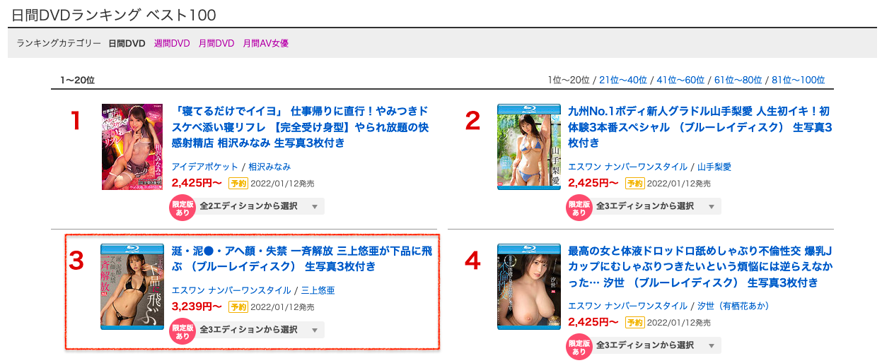 喜不喜歡女優外型、欣不欣賞她們的片子是很直接的感覺,但對片商而言只要會賣就是好作品,而銷售排名就是最好的驗收方式ー上次有說了,身為公認的天下第一人,三上悠亜厲害的是她打遍天下幾乎沒有對手的社群經營能力,但銷售嘛⋯在月初更新的11月排行榜她雙雙跌出前十(DVD銷售及所有作品累積銷售),對一般專屬女優來說還是不差,但她可是業界片酬的天花板三上悠亜,這樣的成績恐怕會讓片商皺眉頭: