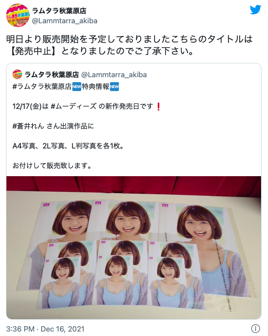 一般來說就那麼幾種情況,首先,女優被家人抓到,前面有提過片商和事務所為了避免事情鬧大幾乎都會直接下片;再來,女優未成年,片子絕對不能發出去以免成為呈堂證供;最後,片子製作有重大瑕疵,像是漏打馬賽克⋯