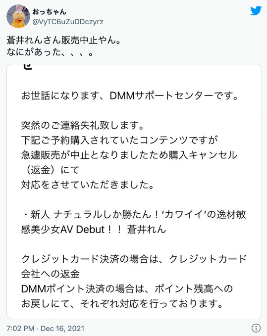 是誰呢?答案是要在Moodyz出道的蒼井れん(蒼井蓮)ー明明片子和生写真已經發到店家手上,但片商一聲令下,作品全部回收不賣了,網站FANZA也立刻刪除了蒼井れん(蒼井蓮)的所有資料,預約的粉絲通通退錢〜