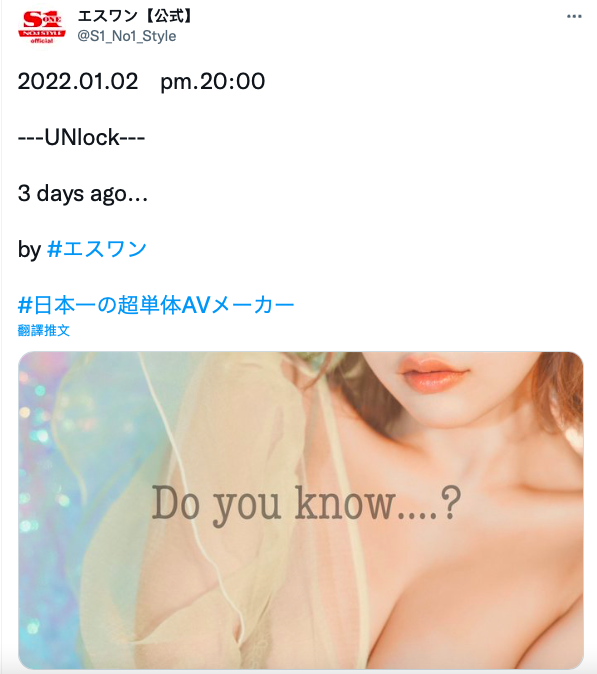 昨天晚上,這家片商於官方twitter放出這麼一個預告:難怪大家會覺得日本人英文很破,1月2日宣布應該是3days later吧?文裡怎麼寫成ago?不過明明大家都已經去放假了,我認識的事務所最早也要1月5日才開工,以S1在業界的地位突然來這麼一手,很顯然地,這是超級新人啊〜