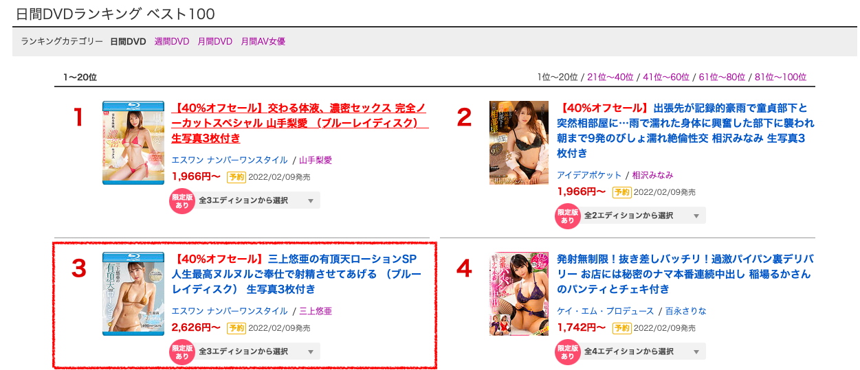 雖然三上換上了連身泳裝等打扮,讓潤滑油澆下去可以凸顯她愈來愈魔鬼的身材,不過這仍然是一支很偏癖好類的作品ー而從昨天的日間排名來看,三上還是三上,不管是什麼樣的企劃她都能交出穩定的成績(贏她的前兩名一個是超級新人一個是日間榜的魔鬼),只要今明兩天不要排名暴跌,以這一行「前三天決定賣得好不好」的慣例就代表這支作品銷售過關了: