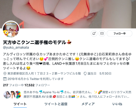 不太對勁啊,我們都知道日本經紀人協會強烈要求旗下成員不得讓女優去拍無碼影片,所以會出現在FC2或DTI集團(就加勒比、一本道、Heyzo等片商)出鮑的幾乎都是無經紀公司所屬的女優。但這次的天方ゆこ(天方由子)不同,她不但才去了SOD酒場的活動,twitter也一直有更新,雖然沒有提到自己拍無碼的事,但她酒照喝舞照跳歌照唱,看起來正常的不得了〜