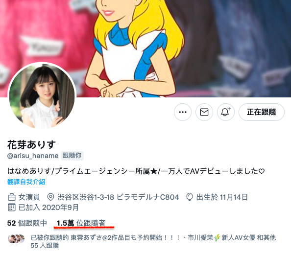 先別說有沒有比其他女優更漂亮或更能幹了,花芽ありす(花芽有朱)光是人氣就讓人擔心了ー別看她不到一個月就完成了twitter追蹤一萬人,從去年7月完成目標到現在你看看她增加了多少粉絲?