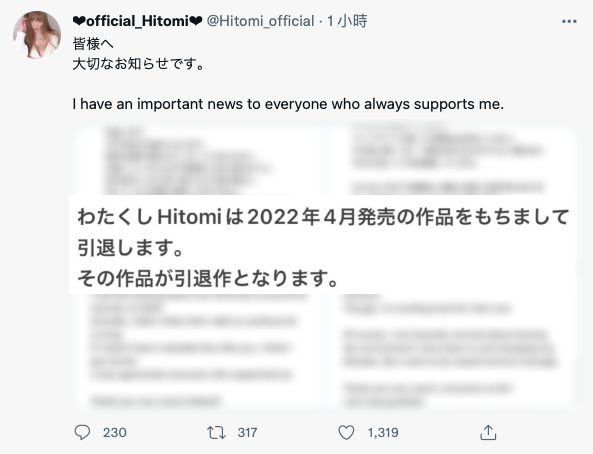 這位以巨乳症著稱、奶子之大遠超過想像的女優(現在應該是Q罩杯)是在2月的最後一天宣布了引退的決定,4月的作品就是她的告別作ー她說早在兩年前(2020)的夏天就在考慮引退的事,直到今年才下定決定要和AV女優的身分說再見⋯