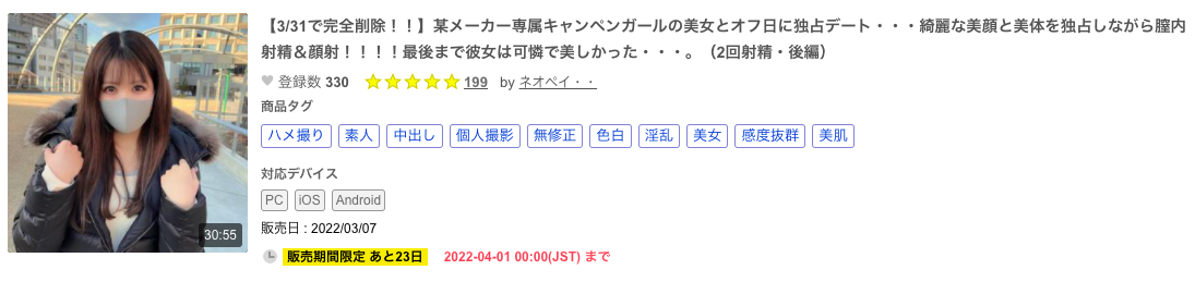 賣家還是上次那位「 ネオペイ」,番號是「FC2-PPV-2703027」,作品說明欄很明白地告訴我們這是期間限定販售的作品,3月31日就會刪除,絕不再販;而從乙白的打扮就知道這是和前一支一起拍攝的片子,乙白是和賣家一起約會壓馬路,雙方情投意合情不自禁,然後就開房間啪啪啪了: