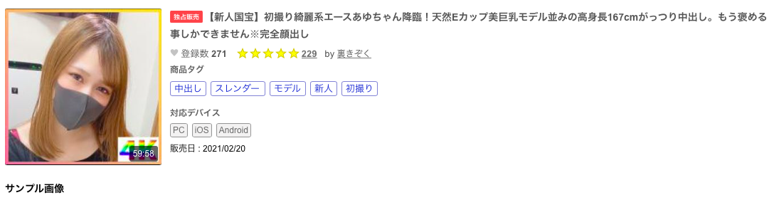 早在去年2月的她就和FC2的無碼賣家有了連結:番號FC2-PPV-1693887的作品「【新人国宝】初撮り綺麗系エースあゆちゃん降臨!天然Eカップ美巨乳モデル並みの高身長167cmがっつり中出し。もう褒める事しかできません※完全顔出し」告訴我們她的確個子很高(167公分)而且還是個可以被稱為國寶的美女,然後這人還很大方地露了臉ー