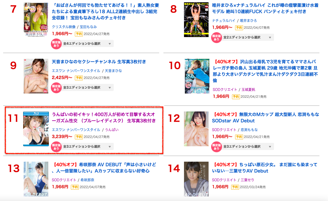 很無聊嗎?其實也還好,因為我一直認為うんぱい(Unpai)蠻會演的,這次完整地秀出劇照和影片就可以發現她詮釋高潮的模樣蠻特別的:她會仰天長嘯、進行一個翻白眼的動作然後脫力往後整個倒下去,似乎真的是被男優一發入魂ー只是她演得認真,作品第一天預約的成績並不算理想:
