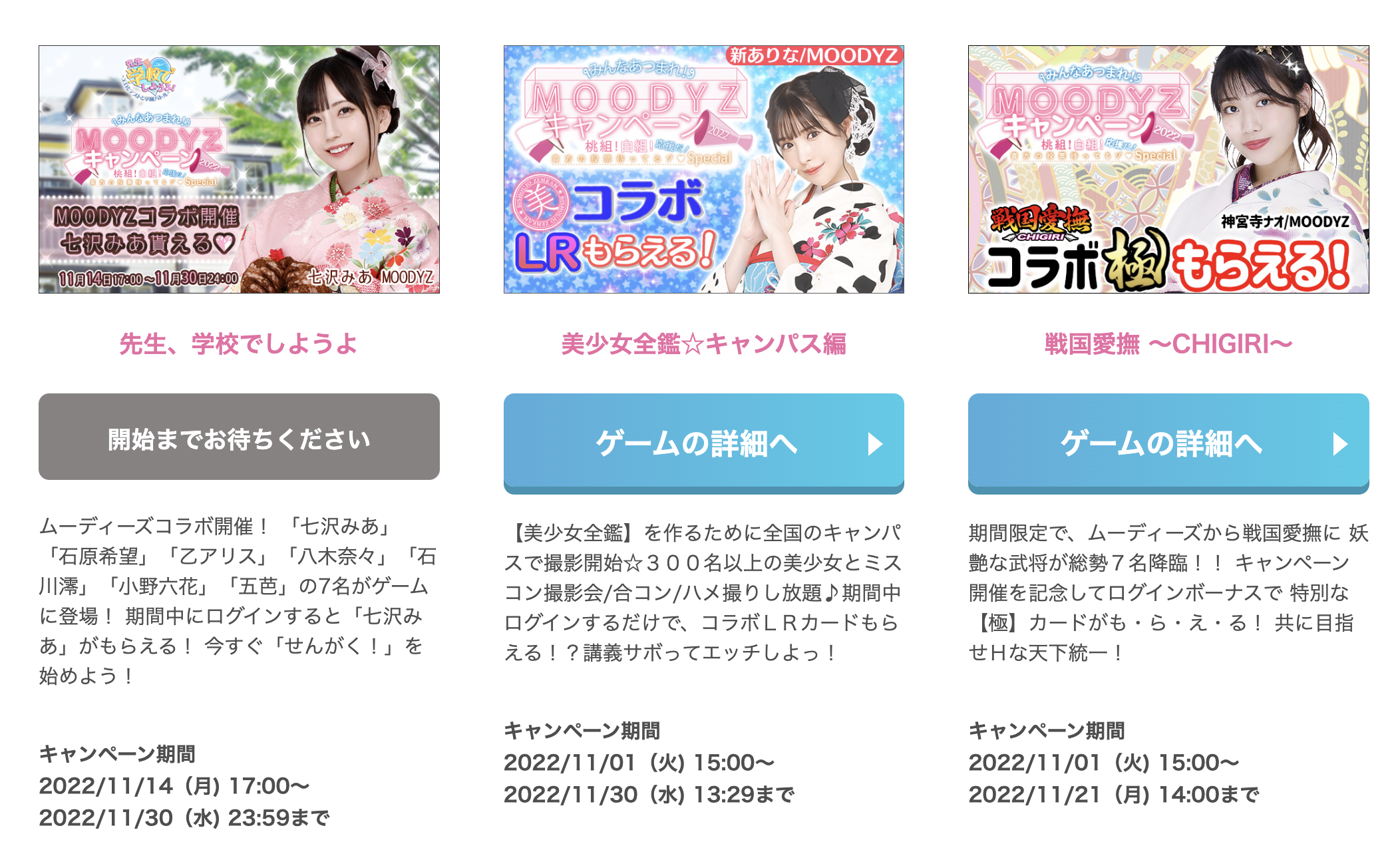 至於這個宣傳活動怎麼麼玩呢?因為幫忙宣傳的女優很多,所以Moodyz把女優們分成了桃組和白組展開競賽:桃組是由新ありな(新有菜)站在C位,白組則是讓七沢みあ(七澤米亞)站在中間,Moodyz是由通販(實體作品65折起,多買還送特典影像)、500円(台幣110元)的MOODYZキャンペーン2022 specialDVD、原創商品(File夾、生写真套組、人形立牌)以及女優身上的泳裝拍賣來看看白組桃組誰的人氣高,另外,還有數位寫真集發售、女優也會參加線上聊天室宣傳這個促銷活動,最後還與電玩遊戲連動,你可以在遊戲中使用Moodyz的女優打天下: