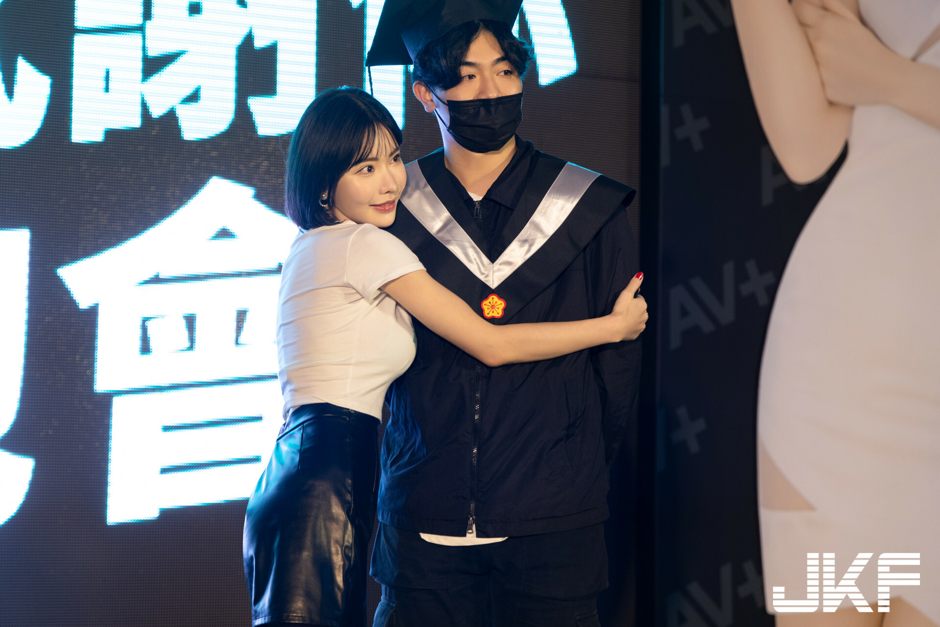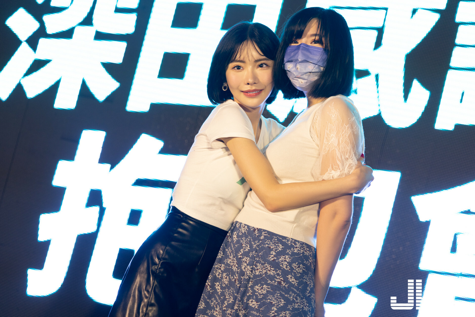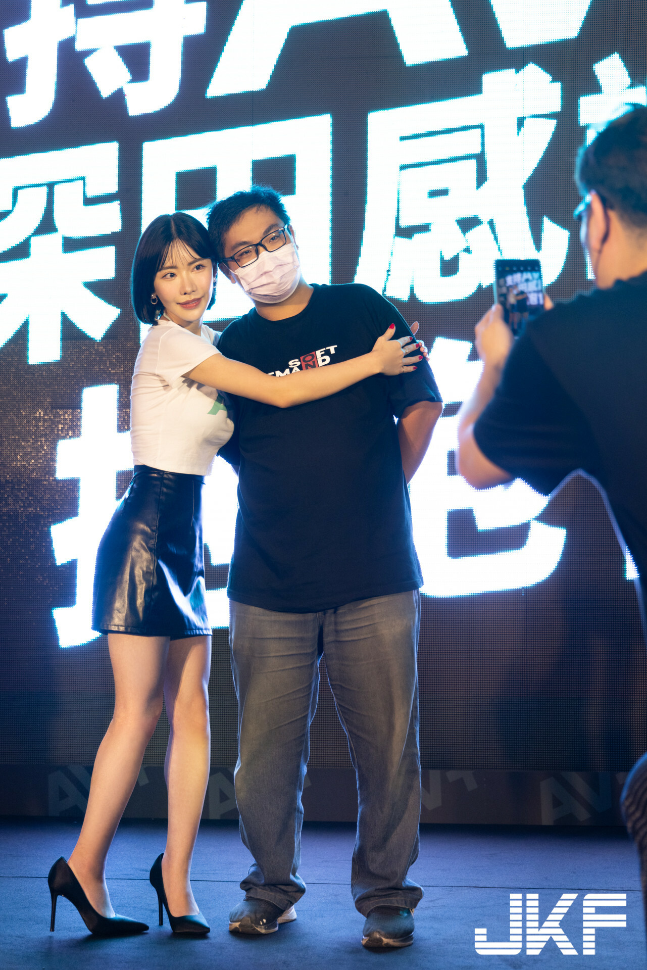 我往舞台上看了一下,確實,一個個子高挑的女粉絲正在舞台上和深田えいみ(深田詠美)愛的抱抱,經紀人在那邊發出狼嚎,和我說:「台灣的女孩真不錯⋯」