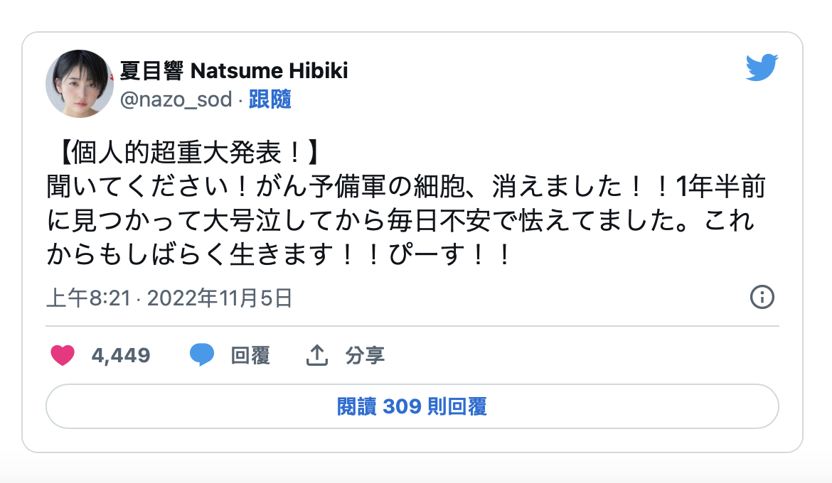 不過還好,在最新一次的檢查已經沒問題,癌細胞消滅了,所以夏目響開心地說自己會活很久、Peace!