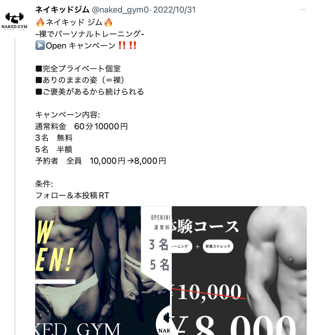 原來是有個名為「ネイキッドジム」的團隊租借她的健身房招生,這看起來沒太大問題,但如果你知道ネイキッド(Naked)是「裸露」的意思就會覺得不太妙,在twitter的招生廣告中,可以看到這個團隊不只是穿著BVD的子彈內褲教導學員做健身,最後更是一絲不掛,甲味甚濃〜