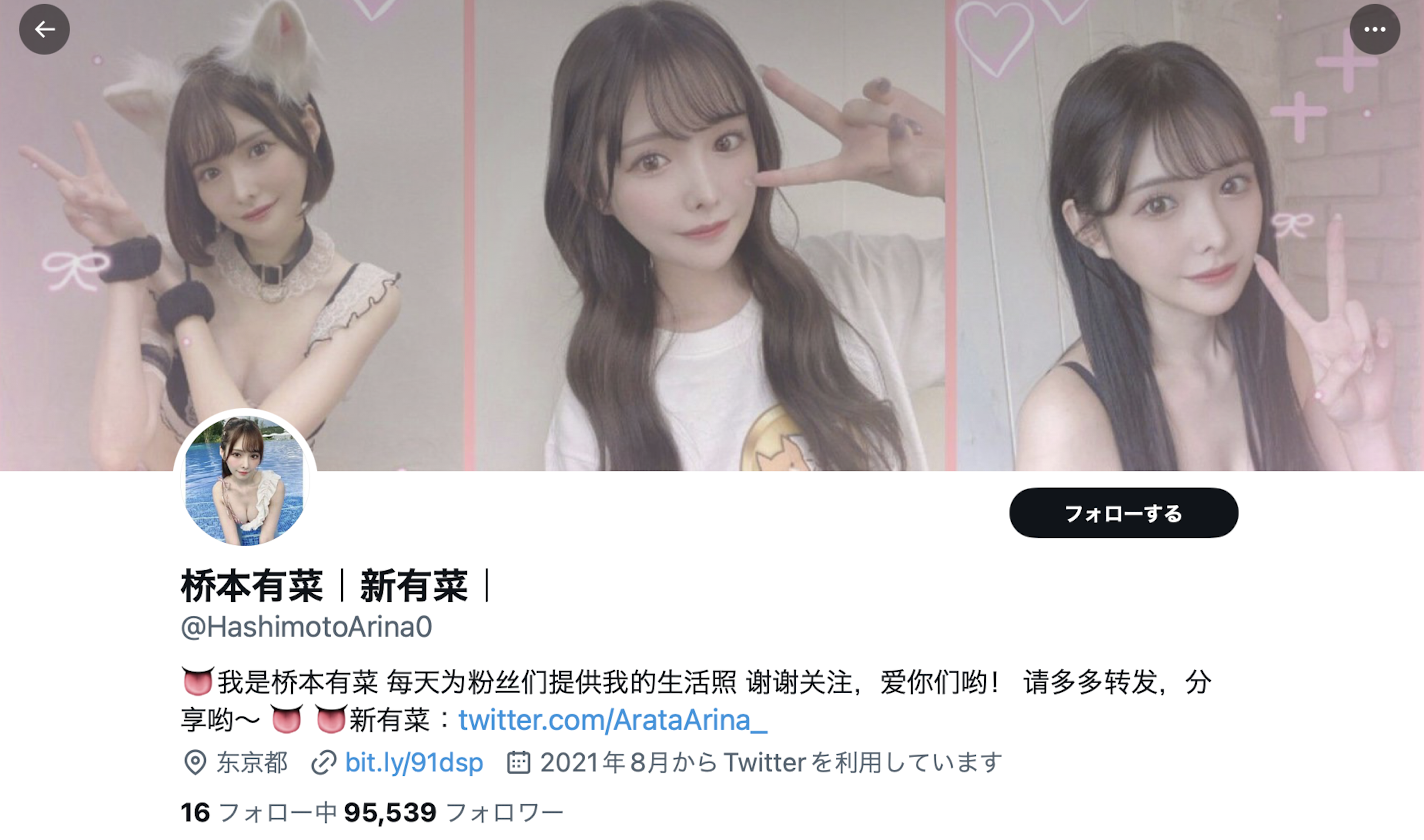 在這裡和大家解釋一下,日本事務所是會授權做中文帳號的,不過他們的目標是微博(Weibo),而且還要身分認證藍勾勾,沒有藍勾勾他們是不要的,但就我打聽的結果是微博最近的審核很嚴,AV女優要拿到身分認證不太容易,有些人信誓旦旦地說他們可以處理但到現在也沒看誰搞定過,所以微博上的每一個新ありな(新有菜)都沒有得到官方授權也不是本人經營;至於twitter,經紀公司的想法很簡單,女優自己經營就好,twitter的翻譯功能雖然超級不精準但也沒必要找人中文化,因為現在要經營twitter已經不容易,除非像Nia這樣有中文底子也想吸台灣粉絲,要不然幹嘛成立其他帳號稀釋自己的流量?