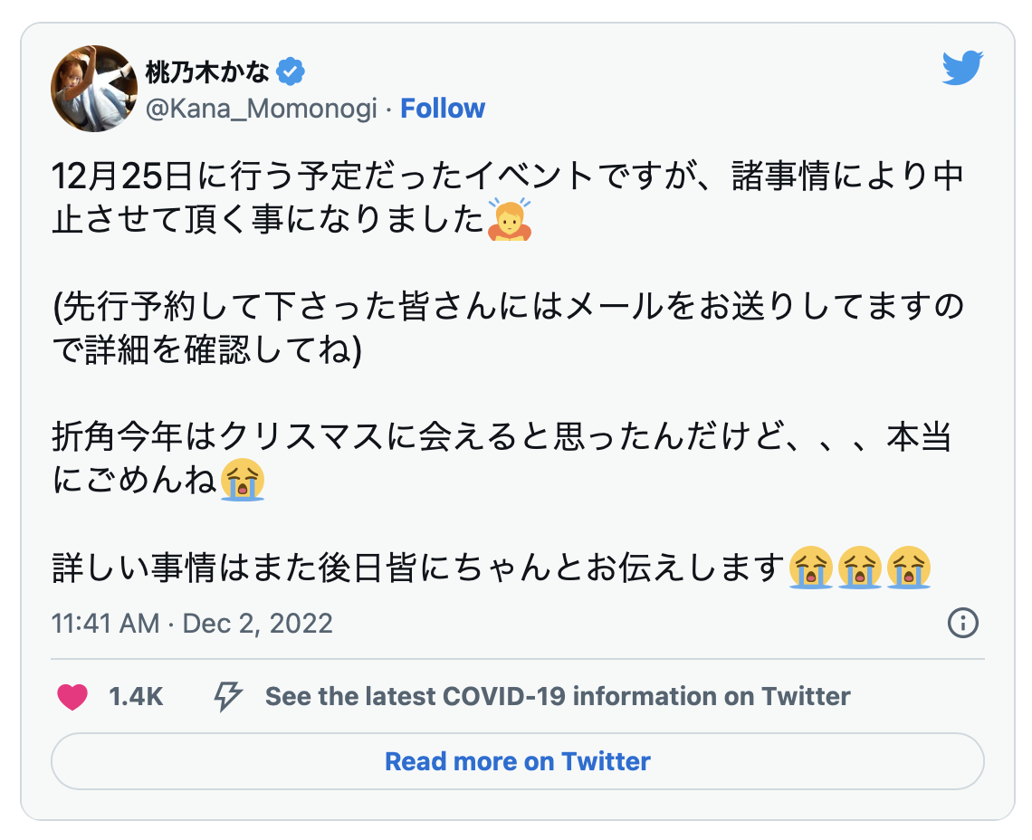 雖然桃乃木かな(桃乃木香奈)不會像小宵和北野一樣突然消失,不過12月2號就取消了聖誕節(25號)的活動還是啟人疑竇,到底是花生了什麼事、讓桃乃木かな(桃乃木香奈)必須取消三個禮拜後的活動?