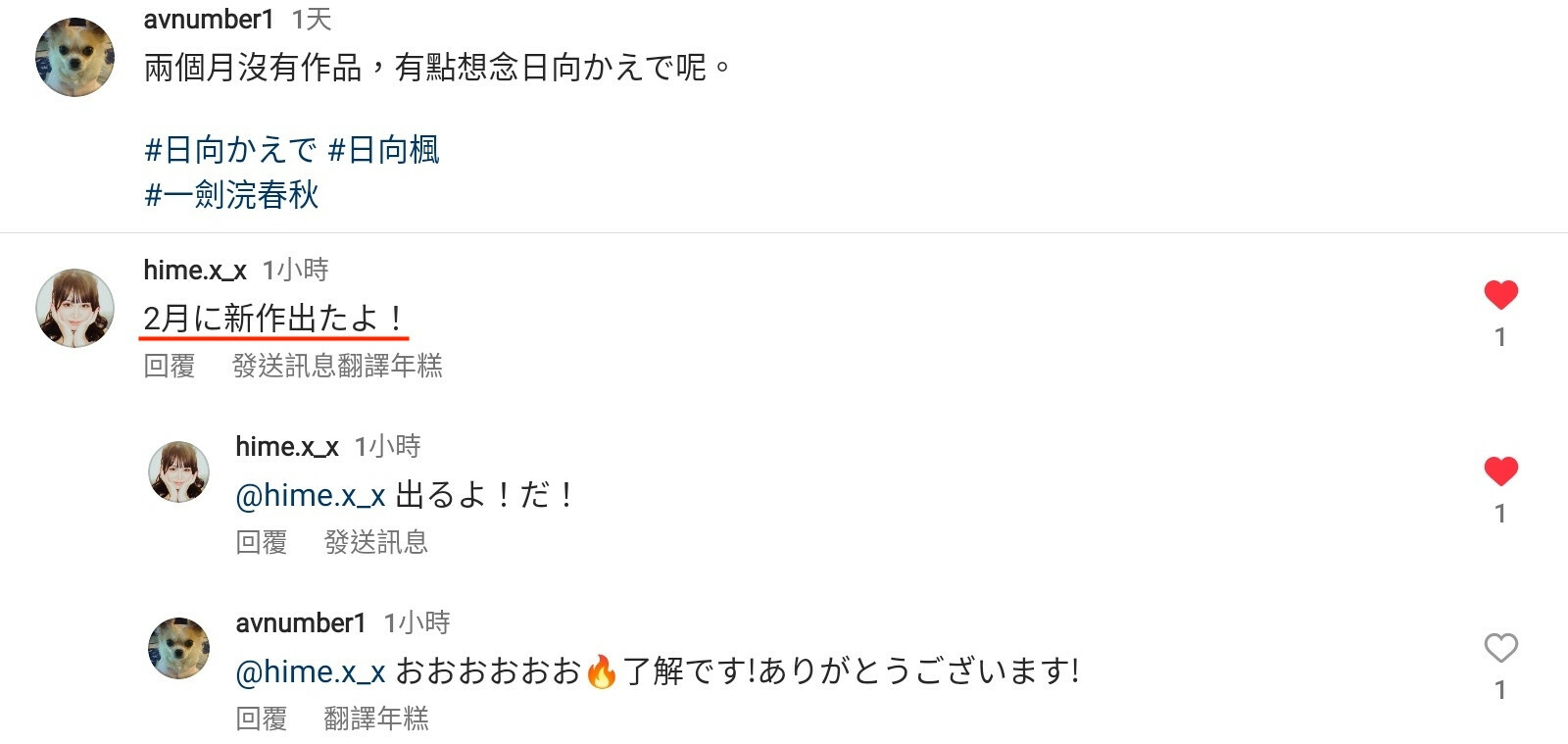 日向かえで(日向楓)是個對社群操作很敏銳的人,所以她每天都在搜尋TAG自己的人看他們寫了什麼,如果是抱怨沒有發片的話她就會留言告訴對方「2月」、「是2月啦」、「我2月就有新片了」: