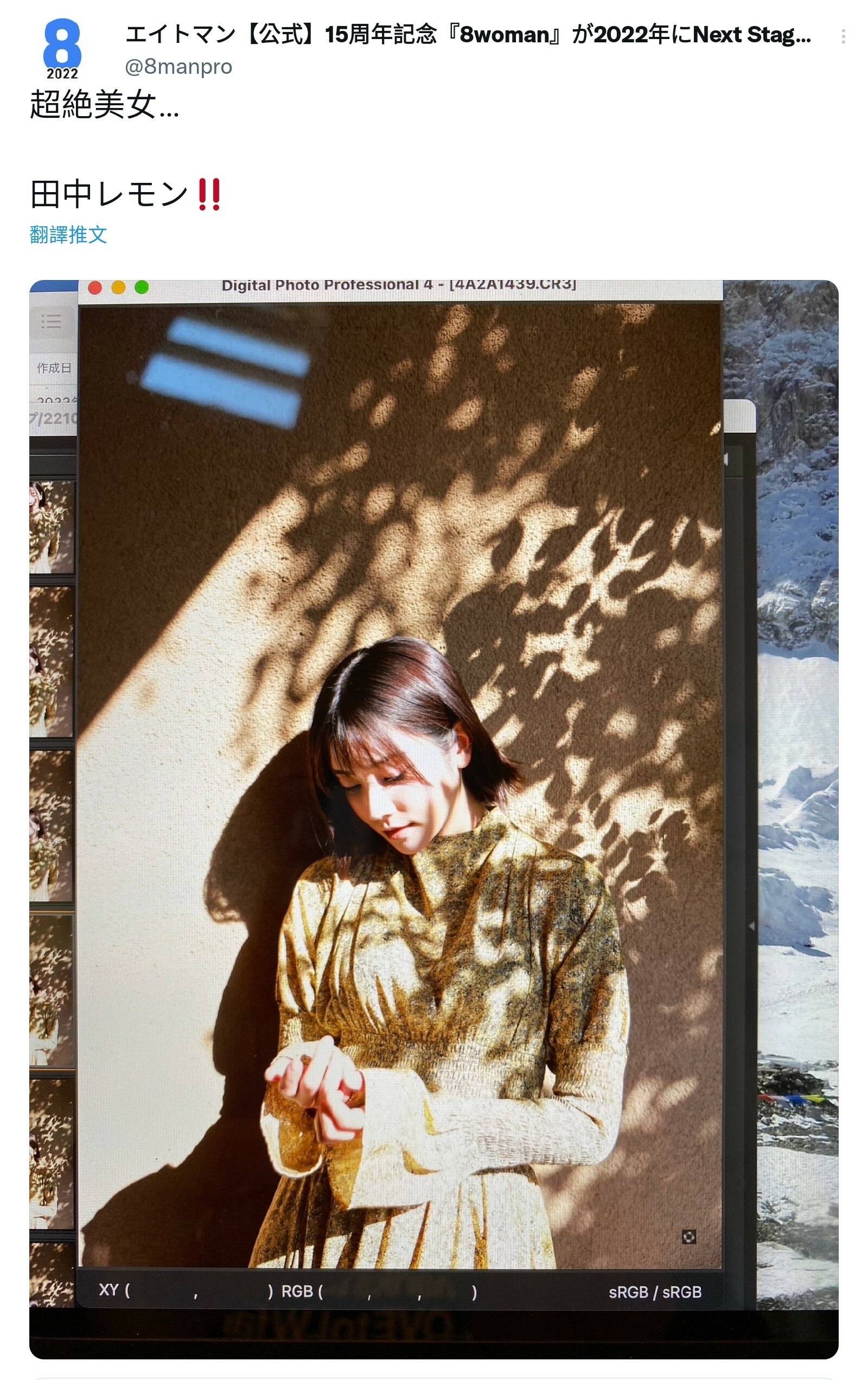 經紀公司8MAN在昨晚突然公布了一張「超絶美女」的寫真側拍,請大家瞧瞧,這位要在1月4日發售的週刊ポスト(週刊Post)登場的田中レモン(田中檸檬)是誰?