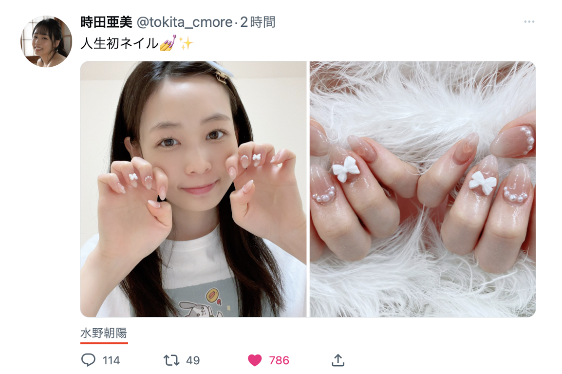 這是什麼意思?意思就是幫時田亜美做美甲的不是別人,正是今年(2022)一開始就退出拍片行列的水野朝陽,我們都知道她第一次引退就是去做美甲,只是因為疫情嚴重生意慘淡所以在深思熟慮後復活再當AV女優,現在疫情趨向共存,水野朝陽也順勢卸下AV女優的頭銜,專心在自己的工作室打拼: