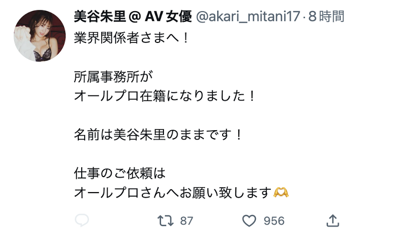 還記得上次我曾和大家說「美谷朱里」的狀況很不對勁?首先,她祝福粉絲新年快樂的貼文並沒有被事務所Cruse Group轉推,接著Cruse Group官網上的主力女優名單也把她拿掉了,最後,美谷朱里也把Cruse Group的官方twitter自追蹤名單剔除,只保留跳槽去AllPro集團的前事務所資深經紀人⋯