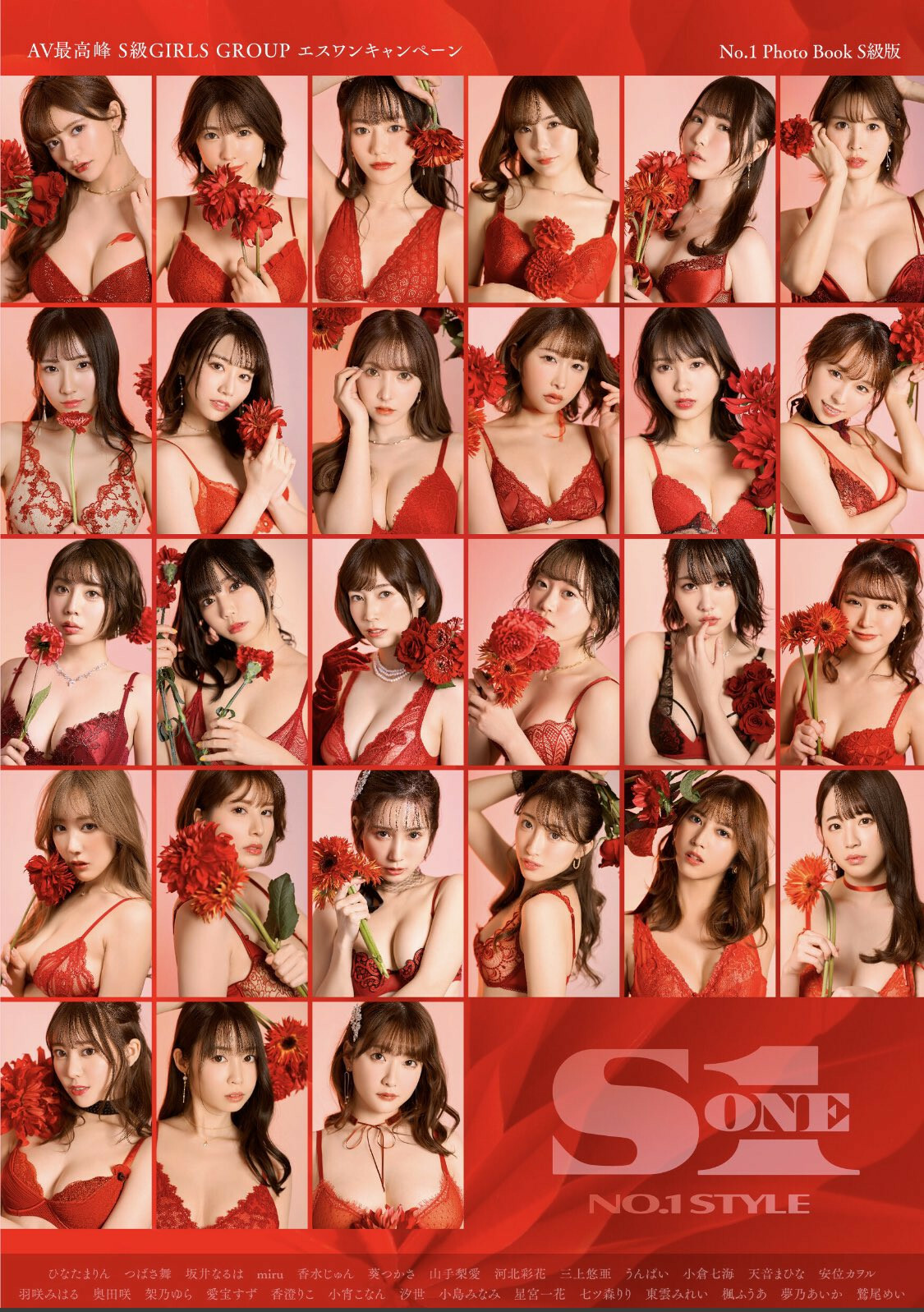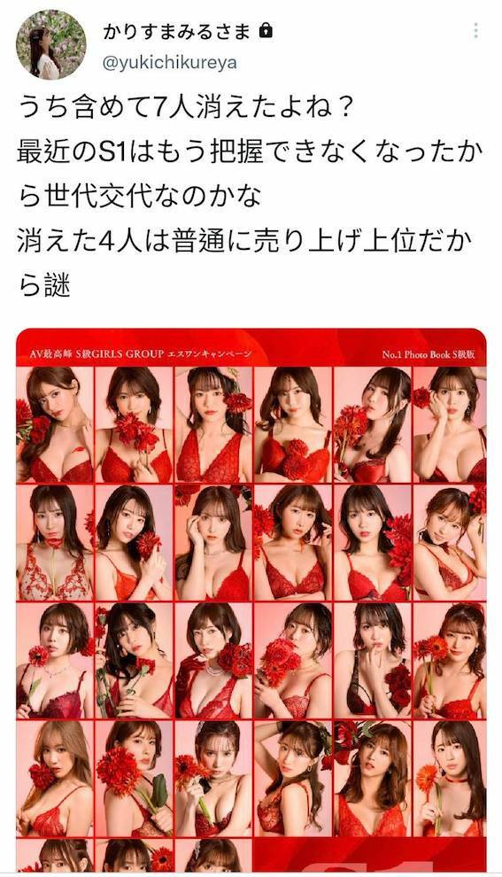 乾,七個人我都湊不齊了,結果是八位女優離開S1?我們一塊兒來看看ひなたまりん(日向真凜)丟出來的那張圖:那是S1在去年(2022)動員所以女優進行的促銷活動,照片上一共有27人:從第一排左至右開始算分別是ひなたまりん(日向真凜)、つばさ舞(翼舞)、坂井なるは(坂井成羽)、miru、香水じゅん(香水純)、葵つかさ(葵司);第二排左至右分別是山手梨愛、河北彩花、三上悠亜、うんぱい(Unpai)、小倉七海、天音まひな(天音真比奈,後來改名為星まりあ);第三排由左至右則是安位カヲル(安位薰)、羽咲みはる(羽咲美晴)、奧田咲、架乃ゆら(架乃由羅)、愛宝すず(愛寶鈴)、香澄りこ(香澄莉子);第四排由左至右則是小宵こなん(小宵虎南)、汐世(後來改名凪ひかる)、小島みなみ(小島南)、星宮一花、七ツ森りり(七森莉莉)以及東雲みれい(東雲美玲);最後一排由左至右則是楓ふうあ(楓富愛)、夢乃あいか(夢乃愛華)以及鷲尾めい(鷲尾芽衣)〜