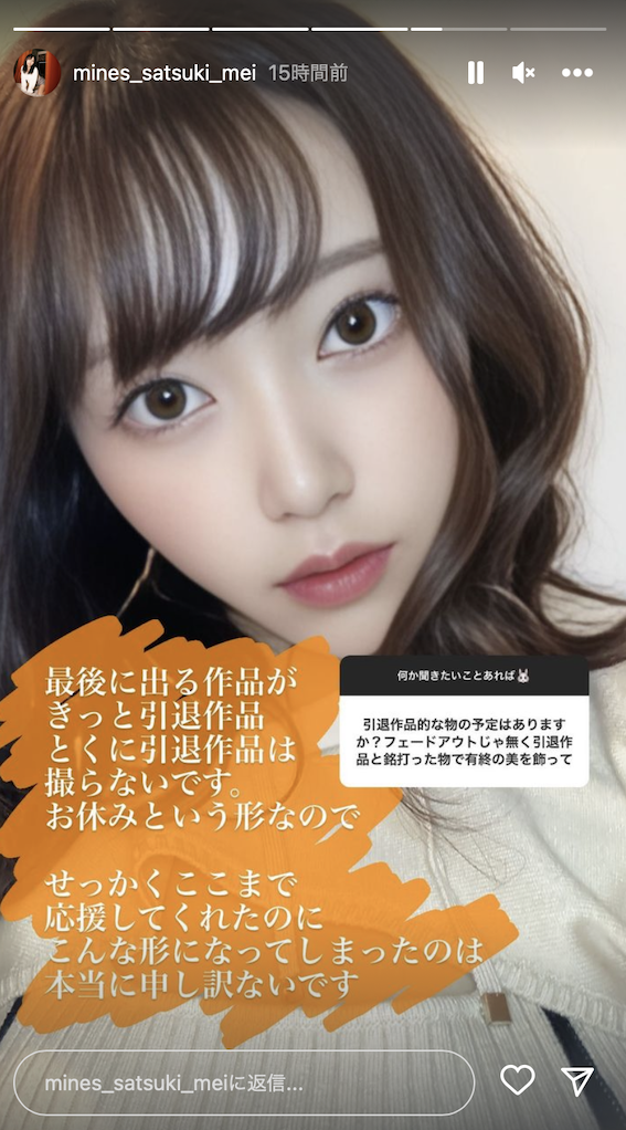 雖然對外說是休業,但さつき芽衣(沙月芽衣)已經當自己引退了,她說不是討厭這份工作,而是希望用感謝的方式說再見ー坦白講,我相信さつき芽衣(沙月芽衣)用IG問答的方式宣布這個決定一定是字字斟酌,但從字裡行間就知道她意志很堅定,就是要和AV女優的身分切八斷了⋯