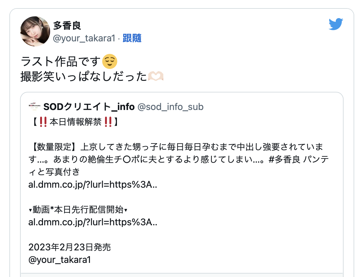 看過作品就知道多香良的條件真的不錯,一身OL的氣質很適合演出各種劇情片不說,長身美脚以及渾圓的美乳都讓人看得很硬;只可惜她出道時正是日本肺炎疫情最為猛烈的時候,再加上在twitter凍結的時候把帳號上鎖導致漲粉停滯讓她出道沒多久就毫無存在感,講句比較不客氣的話,以她交出來的成績能在SOD Star待到現在也真是奇蹟了〜