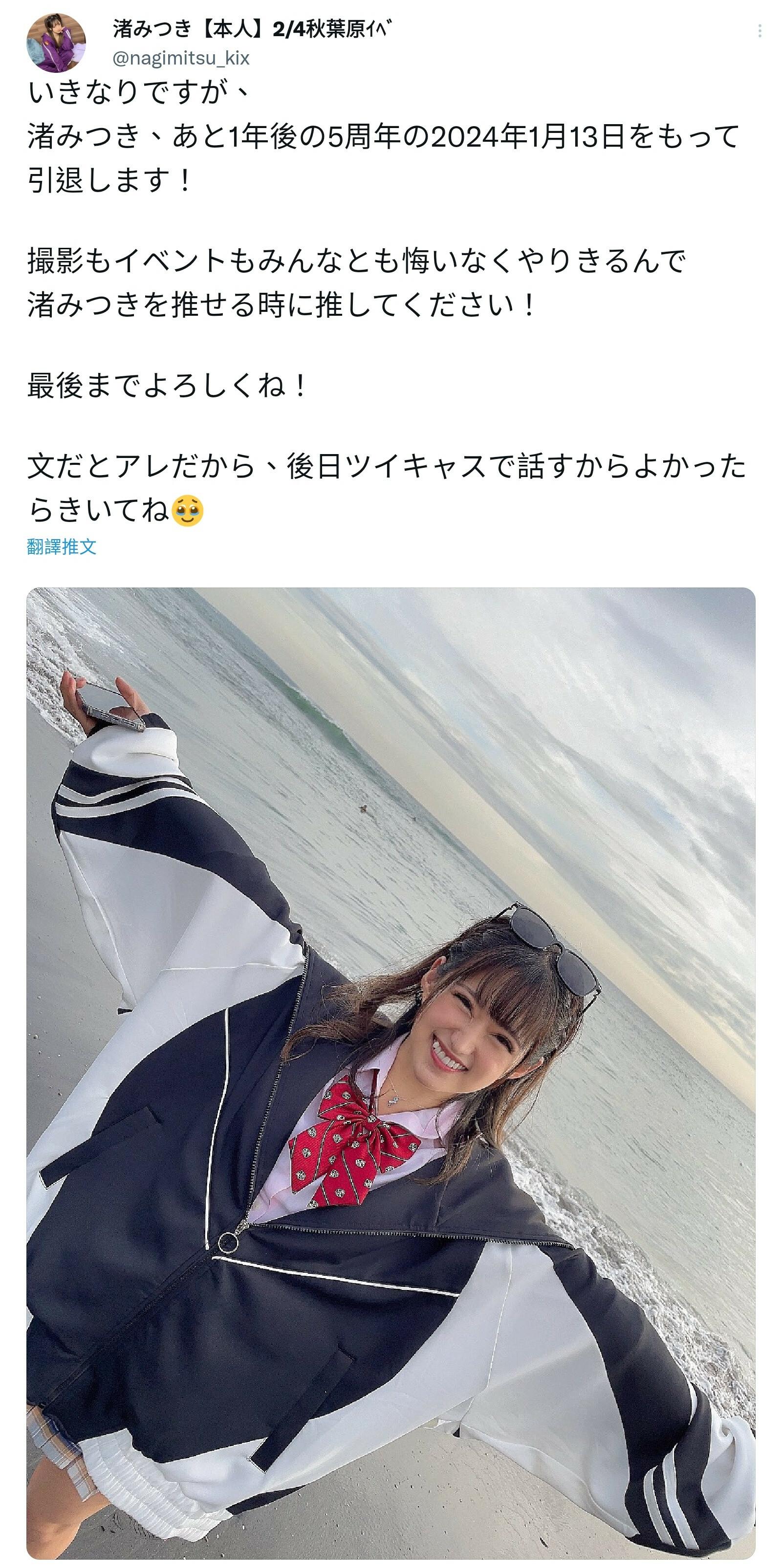 這位之前才因為網路平台MGStage忘了打碼而讓小妹妹走光的企劃女優(就是沒有和片商簽訂專屬合約,可以四處遊走去各片商拍片的女優)是在社群宣布將會在2024年1月13日引退,為什麼挑在1月13日呢?因為那是她的出道作「他校でも噂になった埼玉県K市にある学校一の美少女 渚みつきAVデビュー」發行的日子,她要在出道五週年的同時終結AV生涯〜