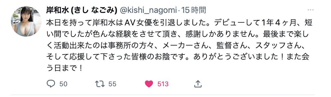 奮鬥了一年四個月,巨乳女優「岸和水」宣布,即日起引退。