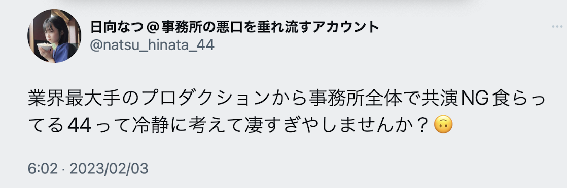 「44Management(日向的經紀公司)被業界最大間的事務所拒絕所有共演,冷靜想想這不是超嚴重的?」