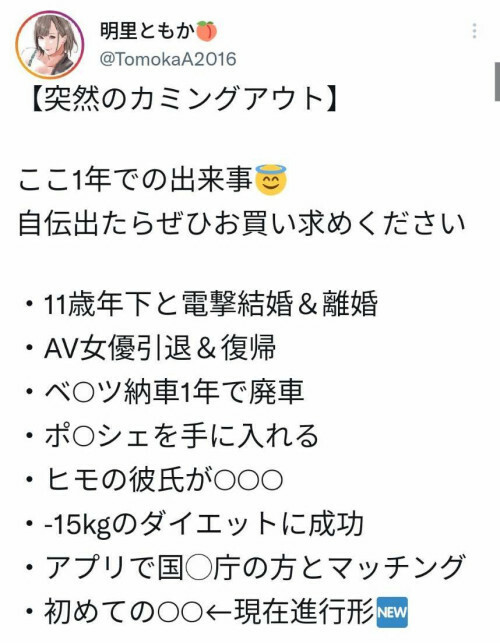 一度引退又復出的明里ともか(明里友香)就在twitter上瘋狂爆料,先講和錢沒關係的事:她說在這一年間,她先和一個比自己小11歲的底迪結婚又離婚然後再復出拍AV,然後又交了個吃軟飯的男友(後面她打了一堆圈圈所以我不知道後來發生了什麼,但應該是分手了),在減重15公斤後她開始玩交友APP,結果釣到的是國稅廳的官員,還有了第一次的「○○○」經驗(一樣沒有說明):