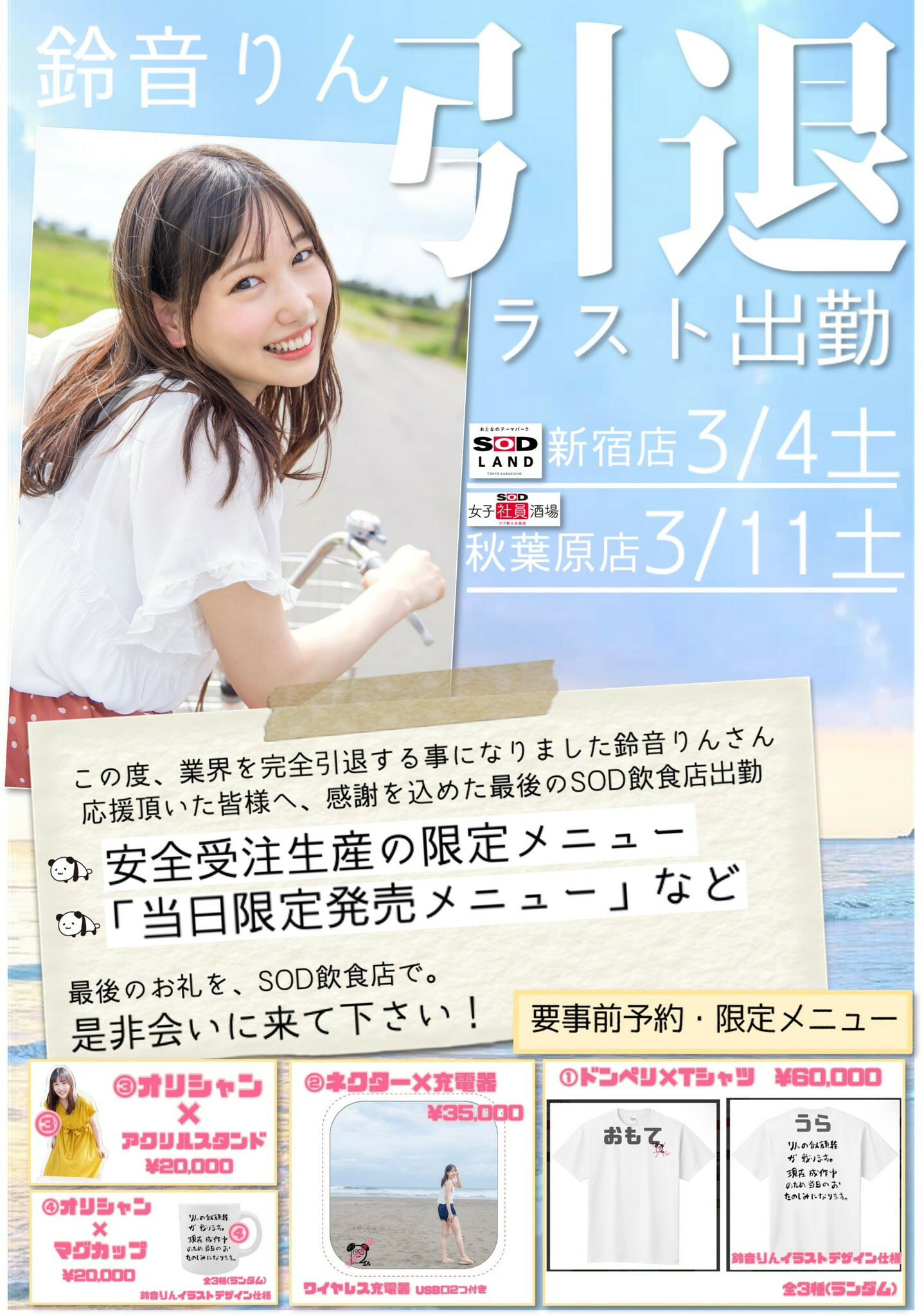 雖然宣布成為自由球員投入企劃女優市場,也積極參與SOD女子酒場的活動,不過SOD Star專屬出道的女優「鈴音りん(鈴音鈴)」還是撐不下去了: