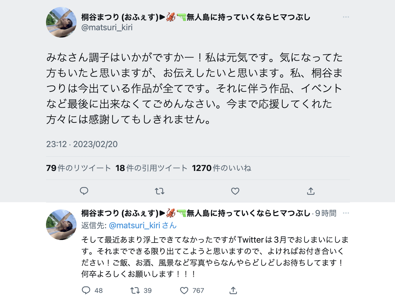 桐谷まつり(桐谷茉莉)也不例外,她先是和大家說聲抱歉,目前在市場上的作品就是她的全部了,她對沒能有新的作品或者和大家好好說再見的活動感到遺憾,對一直支持自己到現在的影迷只有感謝再感謝;然後她話鋒一轉,說最較twitter比較少更新是因為她打算要在3月完全自桐谷まつり(桐谷茉莉)這個角色抽離,社群將要關閉〜